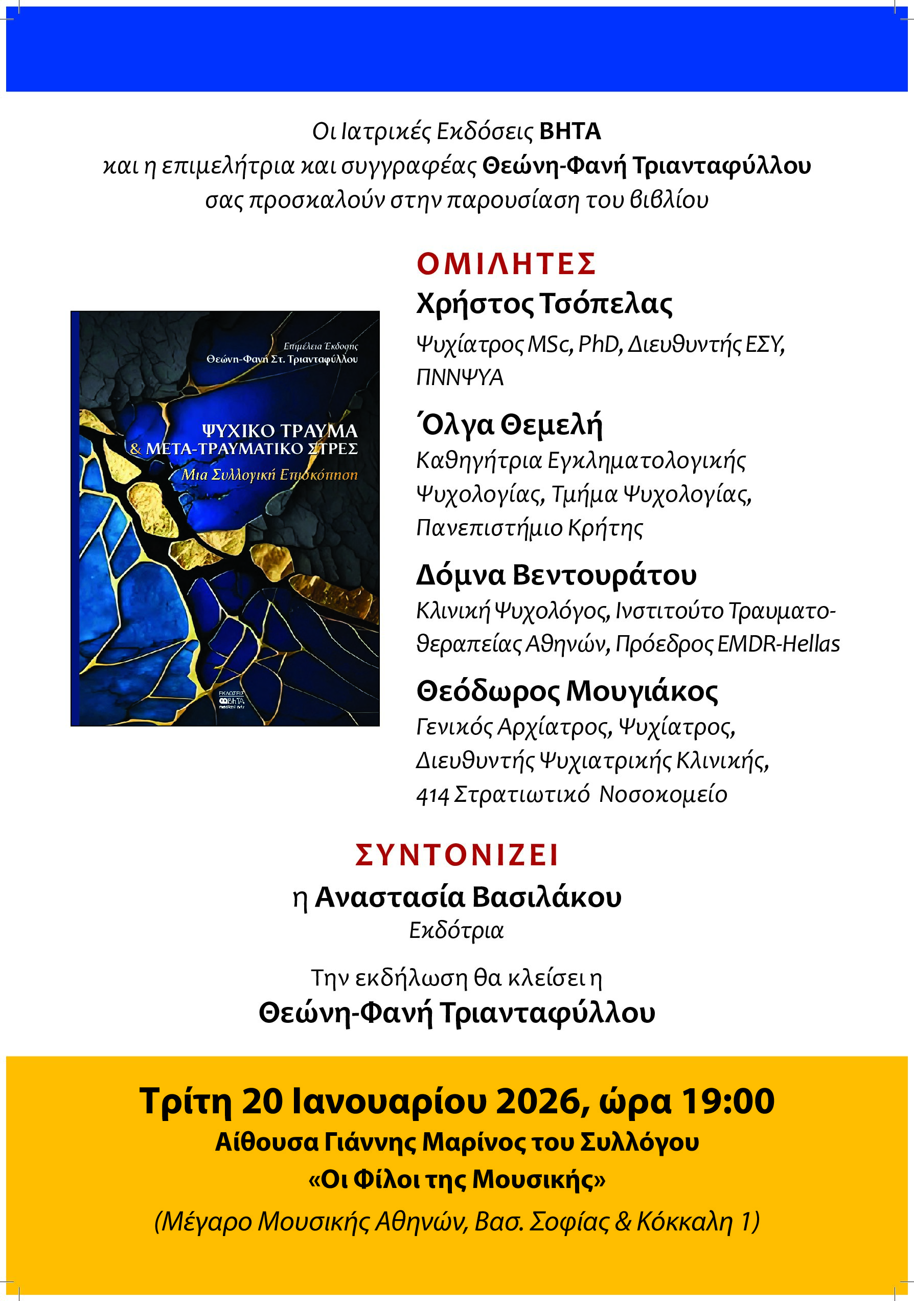 Τρίτη 20 Ιανουαρίου 2026 και ώρα 19.00 – Παρουσίαση βιβλίου «ΨΥΧΙΚΟ ΤΡΑΥΜΑ & ΜΕΤΑ-ΤΡΑΥΜΑΤΙΚΟ ΣΤΡΕΣ» σε επιμέλεια έκδοσης της κ. Θ.Φ. Τριανταφύλλου στο Μέγαρο Μουσικής Αθηνών